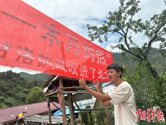 木乃约热考上北大后,同学们为他送来横幅,上面写着“甘洛北大第一人——木乃约热,木乃与热情的夏天有一个约定,甘洛的风吹进了北大!” 中青报·中青网见习记者 王雪儿/摄