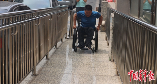 肢残者耿瑞林在北京市西城区白纸坊街道政务服务中心外的无障碍通道通行。先藕洁/摄