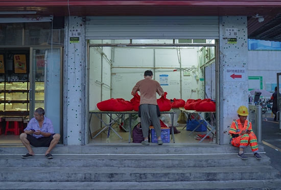 7月26日凌晨,深圳市龙岗区马桥市场,服装商户高文元在当天租下的日租店铺内卸货摆档,准备在7点前开始营业。