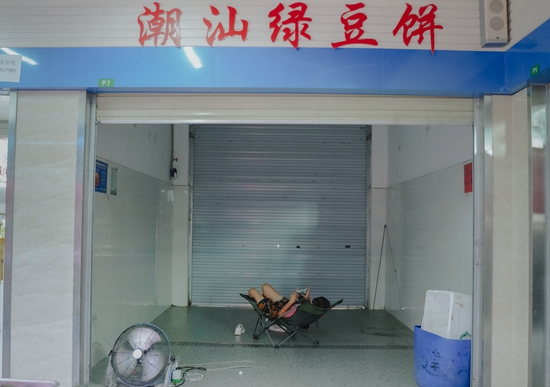 8月2日,深圳市龙岗区扬马市场内,女装商户彭明峰的妻子在一家空置的绿豆饼店内休息,隔壁是一家空置的日租店铺。