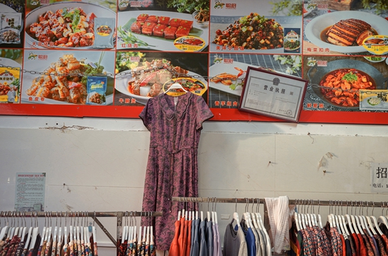 8月2日,深圳市龙岗区扬马市场,一家按日出租的铺位内。这家店在市场登记的是便利店,墙上贴着餐厅菜品图片,这一天店里挂上了女装。