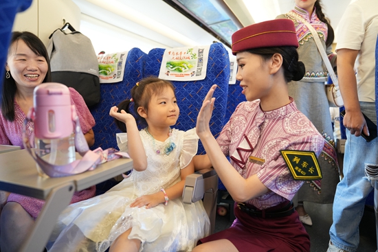 8月31日,在贵南高铁全线贯通运营的首发列车上,毛南族列车长谭晨江和旅客互动。历经6年多建设、全长482公里的贵南高铁穿越地质条件极为复杂的喀斯特地区,沿线分布毛南族、瑶族、布依族等30多个少数民族聚居区。它的开通运营进一步完善了区域交通格局,将极大便利沿线各族人民群众出行,加快旅游等产业发展,对支持民族地区高质量发展、助力乡村振兴、促进高水平对外开放,具有十分重要的意义。曹烁/摄 中青报·中青网记者 谢洋/文