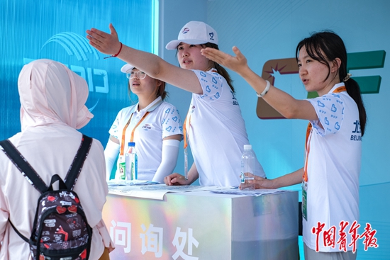 9月3日,北京,2023年中国国际服务贸易交易会首钢园区,来自北京理工大学的学生志愿者为参观者指路。2023年中国国际服务贸易交易会于9月2日至6日在国家会议中心及国家体育馆、首钢园区举办。本届服贸会志愿者平均年龄22岁,00后成为主力。中青报·中青网记者 张玉佳/摄