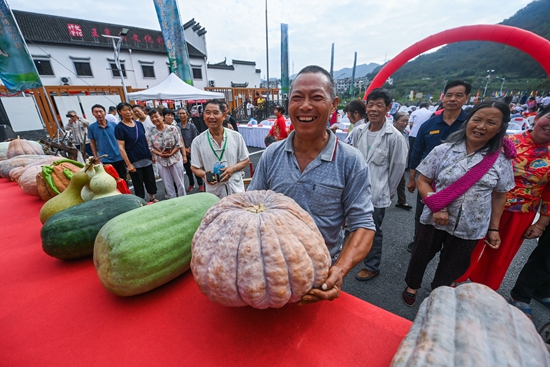 9月3日,浙江省淳安县王阜乡王阜村的村民把自家最大的瓜果拿到“报熟节”现场,准备参加果蔬比赛,迎接丰收。