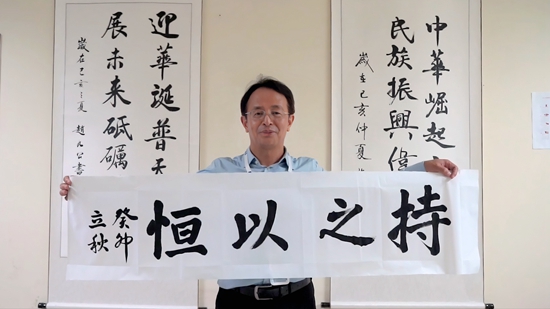 初见陈良富是在遥感科学国家重点实验室的办公楼里。他身穿一件天空蓝的衬衫,站在办公桌前写字,一副银色框架眼镜架在鼻梁上,透过镜片,一双眸子盯着手中的毛笔尖,温和沉静。不多时,几个笔锋稳健的大字——“轻舟已过万重山”,跃然纸上。