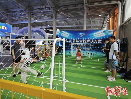 9月2日,2023年中国国际服务贸易交易会开幕首天,两个小朋友在体育服务专题展展区踢球,右侧为相关展位工作人员与人球感知系统装置。