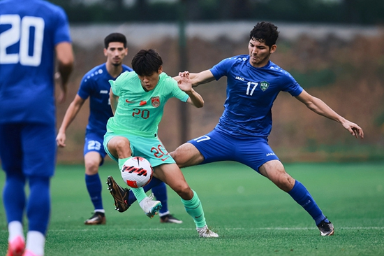 6月热身赛,中国国奥队1∶2不敌乌兹别克斯坦国奥队。图为刘祝润(中)突破防守。视觉中国供图