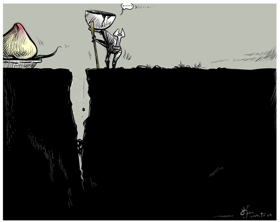 对职工而言,超过一定年龄,便不再获得续聘,就像是通往退休路上的一道“沟”。只有依法让临近退休的职工端稳饭碗,才能有力维护劳动者权益。漫画:徐简
