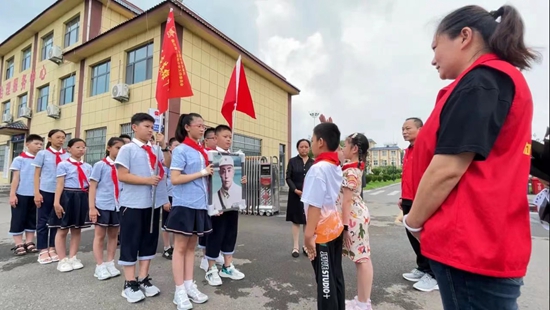 今年7月22日,王丽侠和尹方圆一起带着“庄元东英雄中队”队员们走进庄元东烈士的家乡——沂南县砖埠镇。浙江省宁波市海曙区志愿者协会的少先队员送来了庄元东烈士的高清修复照片。