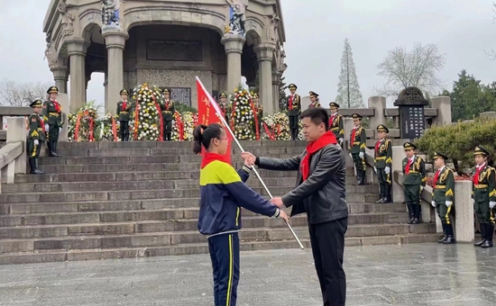2023年清明,在华东革命烈士陵园,团临沂市兰山区委正式向临沂第一实验小学六(7)中队授“庄元东英雄中队”队旗。