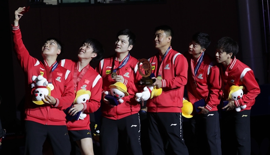 9月6日,中国队选手梁靖崑、王楚钦、樊振东、教练王皓以及选手马龙、林高远(从左至右)在颁奖仪式上自拍留念。