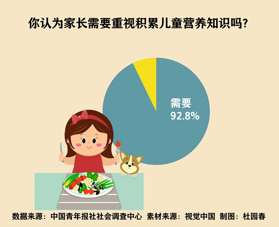 调查中,92.8%的受访家长明确要重视积累儿童营养知识。其中,0-3岁受访儿童家长(95.9%)这一意识最强。