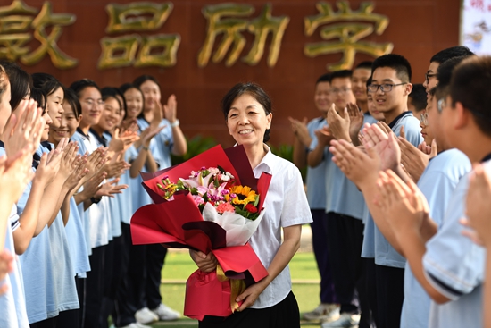 教师节前夕,平民中学学生为即将退休的55岁语文教师路红送上鲜花,感谢她从教33年来孜孜不倦教书育人。视觉中国供图