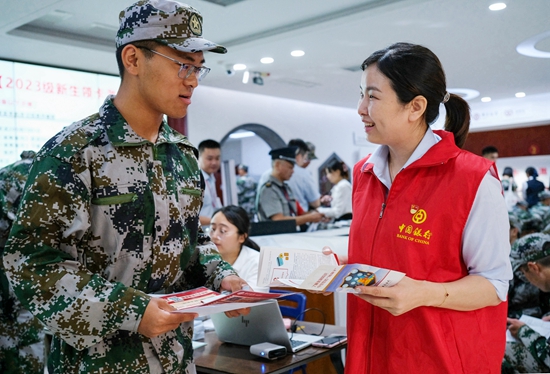 9月6日,湖南省长沙市岳麓区麓山南路,中国银行湖南湘江新区分行辖属湖南大学支行工作人员向前来开卡的大学新生宣讲防诈骗、反假币、反洗钱等金融知识,帮助同学们守住“钱袋子”。视觉中国供图