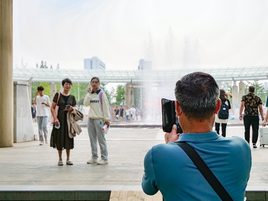 9月2日,日照职业技术学院2023级新生报到现场,新同学和家长在学校日初广场文化墙前合影。王云兴/摄