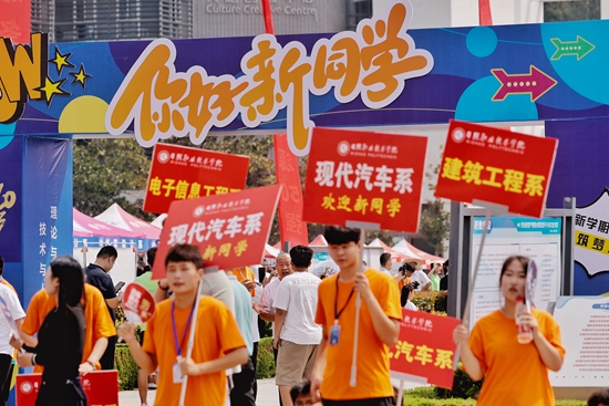 9月2日,日照职业技术学院迎来2023级新生报到,学长们在举牌迎接新生。冷炳豪/摄