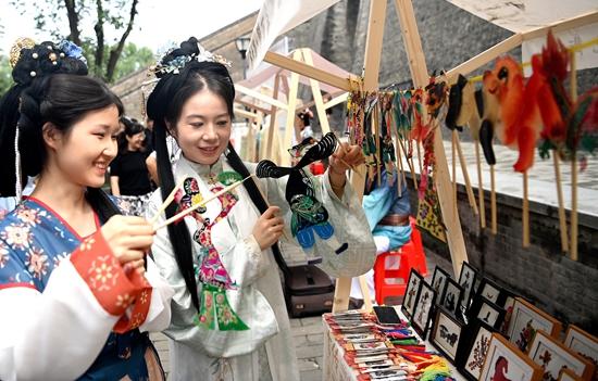 当日,西安市新城区“遇见城墙·非遗韵”非遗集市主题活动在西安城墙中山门下举办。秦腔、华阴老腔等特色非遗节目在永兴坊戏楼前轮番表演,皮影、布艺、工艺葫芦等20多种非遗作品在顺城巷内集中亮相,丰富市民文化生活的同时也让游客感受到陕西非遗的独特魅力。新华社记者 刘潇/摄
