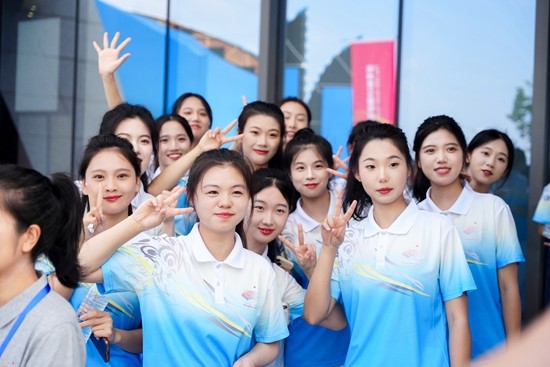 9月12日,杭州第19届亚运会火炬传递宁波站活动结束后,完成志愿服务的宁波职业技术学院“小青荷”合影留念。当天,宁波职业技术学院的341名“小青荷”和36名宁波市北仑区志愿者协会组织的社会志愿者一起参与了志愿服务。中青报·中青网记者蒋雨彤/文 杭州亚组委供图