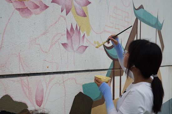 团江苏省昆山市委暑期实施“社区有我 青春报到”行动,200余名大学生团员主动向江苏昆山各村、社区报到,在246个实践岗位上深度参与基层治理。图为一名大学生为乡村手绘墙面。团昆山市委供图