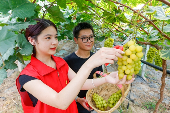 9月20日,安徽黄山,在屯溪区新江村,黄山学院的大学生(左)帮助果农采摘葡萄。当日,该校大学生走进新江村葡萄园,开展社会实践活动,通过线上直播带货、创意视频等形式,帮助果农拓宽销售渠道,助力乡村振兴。施亚磊/视觉中国