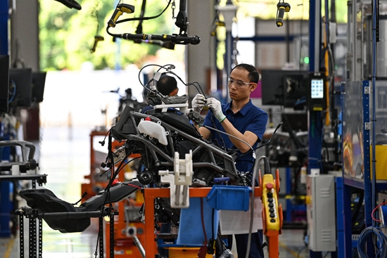 8月30日,越南永福,工人在组装摩托车。美国希望提升美越合作以摆脱对中国的过度依赖,但由于越南缺乏高技能劳动力、基础设施薄弱,只能进口中国的零件和半成品到越南组装再卖往美国。视觉中国供图
