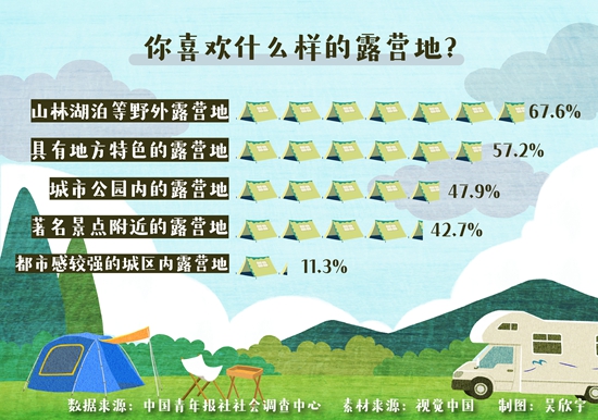 随着露营热度的提升,露营地的种类也变得更丰富。调查显示,山林湖泊等野外露营地最受欢迎,获选率为67.6%,然后是具有地方特色的露营地(57.2%)、城市公园内的露营地(47.9%)和著名景点附近的露营地(42.7%)。