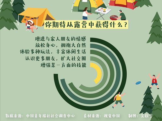 如今,露营正成为年轻人的社交新场景。调查显示,61.5%的受访青年期待通过露营增进自己与家人朋友的情感;49.3%的受访青年希望在露营中扩大自己的社交圈,认识更多朋友。