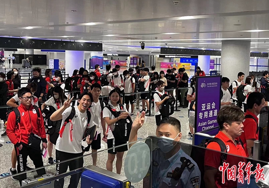 9月21日,浙江杭州,亚运会日本代表团抵达杭州萧山国际机场口岸。当天,杭州亚运会迎来单日入境最高峰。中青报·中青网记者 李剑平/摄
