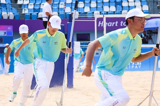 •     9月19日,杭州第19届亚运会第一个比赛日,宁波半边山沙滩排球中心,“小青荷”在球场平沙。杭州亚运会共招募了3.76万名赛会志愿者“小青荷”。这一诞生于G20杭州峰会的志愿者名称,取自宋代诗人杨万里的诗句“接天莲叶无穷碧,映日荷花别样红”。“青荷”是亲和的谐音,寓意很有亲和力。刘殿辉/摄