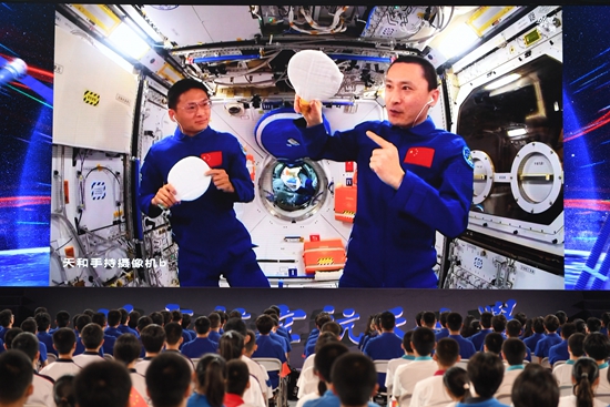 本次太空授课活动继续采取天地互动方式进行。3名航天员在轨展示介绍中国空间站梦天实验舱工作生活场景,演示球形火焰实验、奇妙“乒乓球”实验、动量守恒实验以及又见陀螺实验,并与地面课堂进行互动交流。