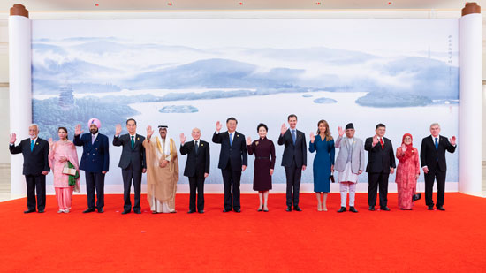 9月23日中午,国家主席习近平和夫人彭丽媛在浙江省杭州市西子宾馆举行宴会,欢迎来华出席杭州第19届亚洲运动会开幕式的国际贵宾。这是习近平和彭丽媛同贵宾们合影留念。新华社记者 黄敬文/摄