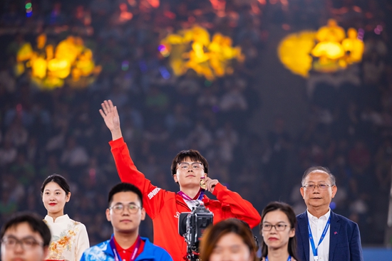 9月19日,第二届全国技能大赛闭幕式在天津市奥林匹克中心体育馆举行。一位获奖选手在向观众致意。视觉中国供图