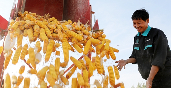 9月22日,山东临沂,郯城县郯城街道农民将收获的玉米装车。视觉中国供图