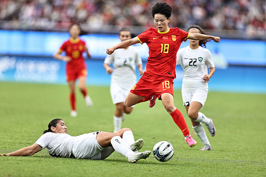 10月6日,中国女足22岁小将欧懿垚(中)第23秒进球创造本届亚运会最快进球纪录。视觉中国供图