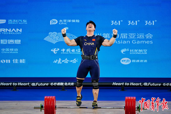 10月6日下午,杭州亚运会举重男子109公斤级决赛,中国选手刘焕华夺得金牌。中青报·中青网记者 赵迪/摄