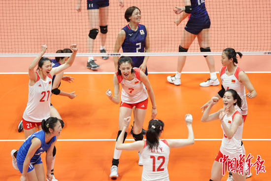 10月7日,杭州亚运会女子排球决赛,中国队庆祝得分。当日,在杭州亚运会女子排球决赛中,中国队以3∶0战胜日本队,获得冠军。这也是中国女排历史上第九次摘得亚运金牌。中青报·中青网记者 李隽辉/摄