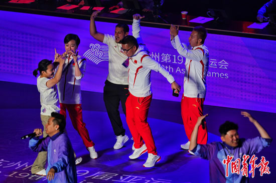 10月7日,杭州亚运会霹雳舞决赛后,中国选手刘清漪(左一)与现场队友、工作人员击掌庆祝。当日,亚运会第一块霹雳舞金牌诞生,刘清漪获得女子金牌,亓祥宇获得男子铜牌。刘清漪也凭借着这枚金牌,拿到了直通巴黎奥运会的资格。中青报·中青网记者 赵迪/摄