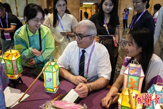 9月29日,浙江省杭州市,杭州亚运会周边文化活动中,一名志愿者向来自法国的外宾介绍关于灯笼的中国传统文化。中青报·中青网记者 赵迪/摄