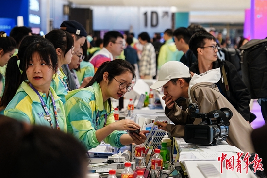 10月8日,浙江省杭州市,杭州亚运会主媒体中心,一名志愿者在服务媒体记者。中青报·中青网记者 赵迪/摄