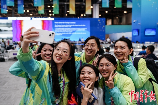 10月8日,浙江省杭州市,杭州亚运会主媒体中心,几名志愿者在合影留念。当日,杭州第19届亚运会闭幕。中青报·中青网记者 赵迪/摄