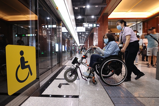 8月7日,北京,残障乘客代表体验无障碍设施及服务。