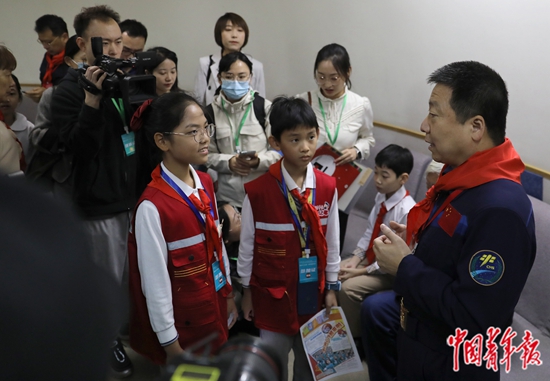 10月16日,北京市少年宫,中国载人航天工程副总设计师、航天英雄杨利伟接受包括《中国少年报》小记者在内的媒体记者的采访。当日,“回望飞天路 逐梦新征程”我国首次载人飞行任务成功20周年——少先队员与载人航天面对面主题队日活动在这里举行。该活动旨在纪念我国首次载人飞行任务成功20周年,传承和弘扬载人航天精神和科学家精神。中青报·中青网记者 陈剑/摄(相关报道见8版)