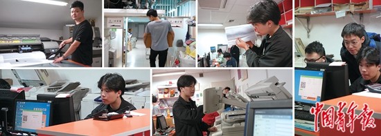 文鼎文博小店是一家位于清华大学校内的较大规模的综合文印店,小店店主与大多数店员均来自湖南省新化县。图为店员正在为校内师生进行打印、复印、装订等服务。中青报·中青网记者 杨宝光/摄