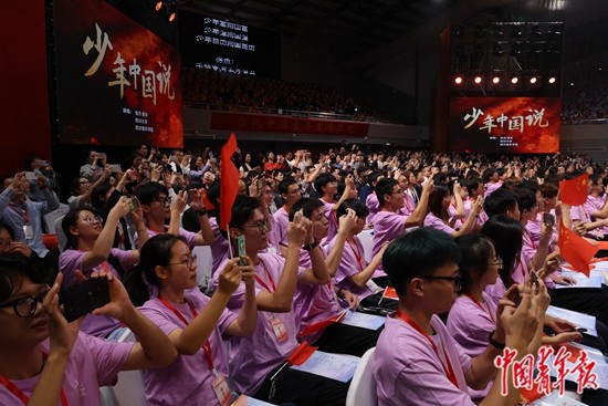 “少年智则国智,少年富则国富,少年强则国强,少年自由则国自由!”在青春歌会环节,四川大学和四川音乐学院的大学生们和着鼓点,与歌手张杰共同唱起了歌曲《少年中国说》。