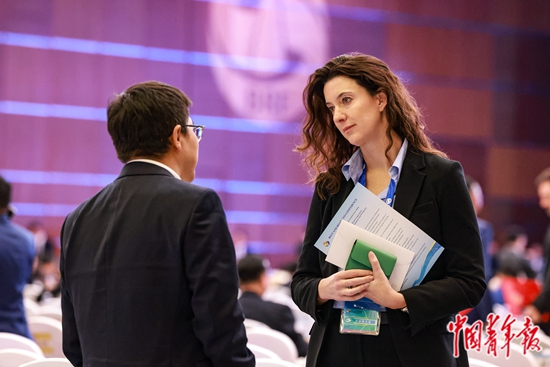 10月17日,北京国家会议中心,第三届“一带一路”国际合作高峰论坛企业家大会结束后,两名代表在会场内交流。中青报·中青网记者 曲俊燕/摄