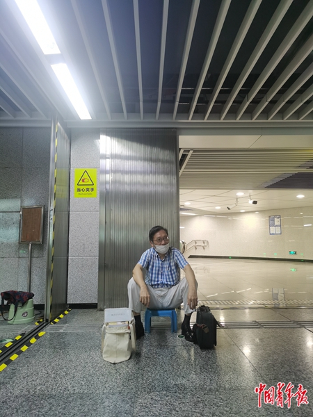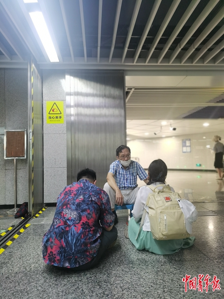 9月7日,重庆红土地地铁站,两位年轻人坐在地上,和王川舟交流。