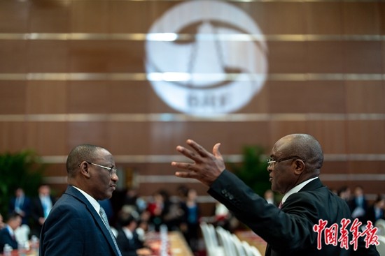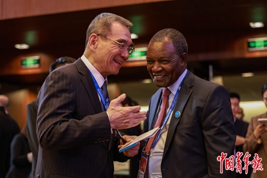 10月18日,北京国家会议中心,第三届“一带一路”国际合作高峰论坛贸易畅通专题论坛开始前,世界银行原副行长、北京大学新结构经济学研究院院长林毅夫(左)与肯尼亚财政和规划部部长恩朱古纳·恩东乌交流。该论坛邀请了数十位“一带一路”共建国家政府官员、专家学者和工商界代表等,聚焦推进高水平贸易畅通,深化多双边经贸合作、提升贸易投资自由化便利化水平等话题。中青报·中青网记者 曲俊燕/摄