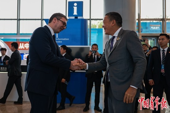 10月18日,北京国家会议中心,塞尔维亚总统武契奇(左)与泰国总理赛塔·他威信握手。中青报·中青网记者 曲俊燕/摄