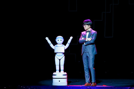 中国杂技家协会魔术艺术委员会委员、魔术演员孙峥将扑克牌随机打乱后,和“i宝”比赛谁能更快记住牌面顺序。“我已经记好了,梅花4、红桃2、方块7、梅花3……”仅用2秒钟,“i宝”摇着圆圆的脑袋、挥动着手臂,快速地报出扑克牌的顺序,萌萌的外表、可爱的语调,博得现场青年学生的阵阵掌声。