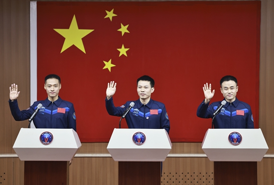•     10月25日上午,神舟十七号载人飞行任务航天员汤洪波(中)、唐胜杰(右)、江新林在酒泉卫星发射中心问天阁与中外媒体记者集体见面。新华社记者 李刚/摄